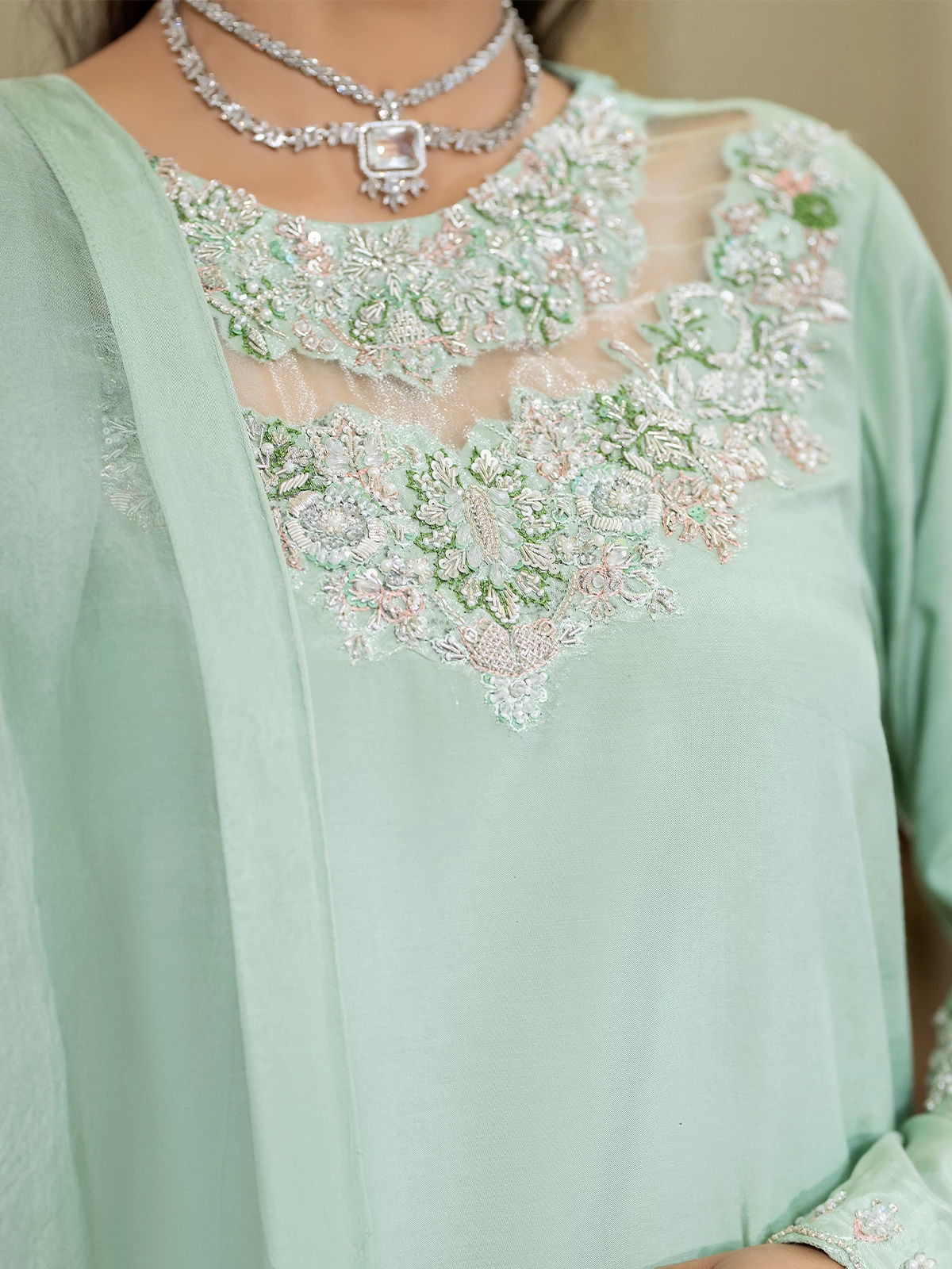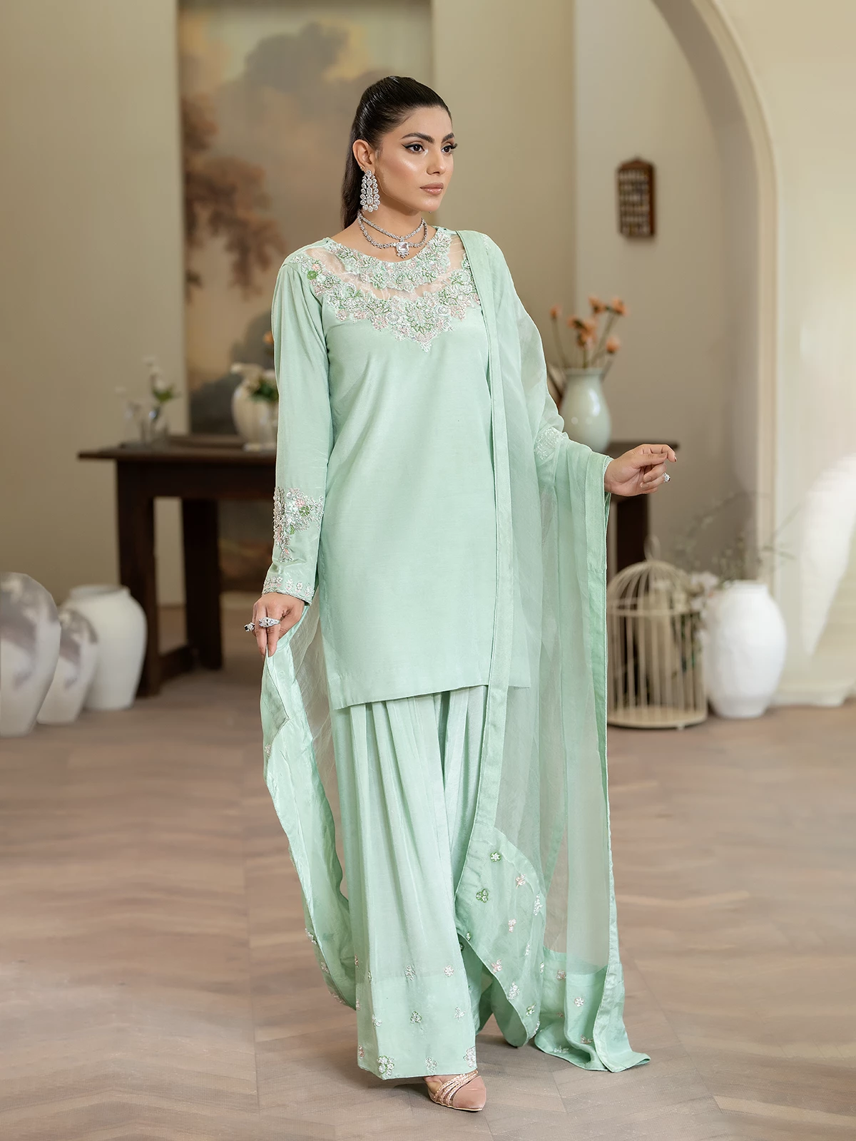 This light MINT green farshi shalwar features motif spray on the bottom for a soft, elegant touch. It is paired with a short shirt that has an embellished neckline with an organza patch and embellished borders on the sleeves. The organza dupatta is finished with a delicate spray on the bottoms, completing the graceful look.