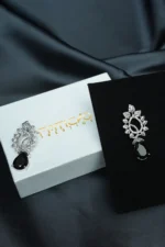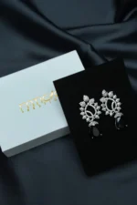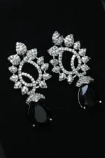 These elegant medium-sized silver earrings feature bold black stones accented with fine zircon detailing. Their balanced design combines classic sophistication with modern charm, making them perfect for both formal events and everyday elegance. A timeless accessory that adds depth and style to any outfit.