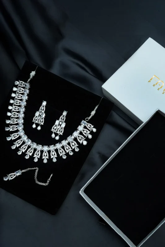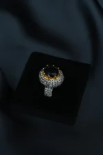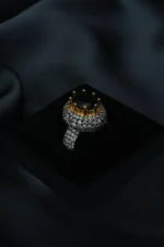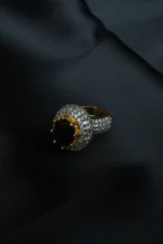 A bold statement of elegance, the Midnight Majesty Ring features a deep black solitaire gemstone set in a radiant gold prong crown. Surrounded by pavé-set zircons that extend across the band, this dual-tone design sparkles with sophistication. Perfect for evening wear, weddings, or festive occasions, it captures a timeless blend of strength and grace. |