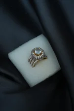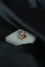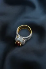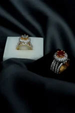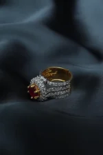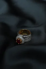 | A stunning fusion of red and silver elegance, the Zurcon Duet Ring features a radiant ruby-red gemstone set atop a shimmering silver multi-band design. Encrusted with fine crystals and finished with golden prongs, this piece captures timeless sophistication and modern allure. Perfect for adding a touch of luxury to any formal or festive look. |