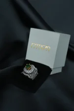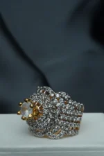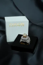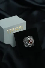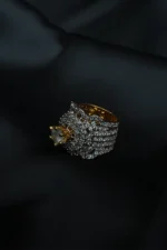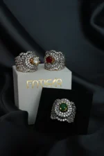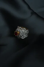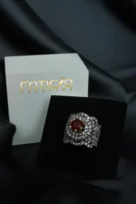 The Zurina Ring is a masterpiece of sparkle and sophistication, designed to make a lasting impression. Featuring a bold round gemstone in three captivating shades — radiant red, emerald green, and classic silver — each piece is encased in layers of shimmering crystals and detailed with gold-toned prongs. The intricate multi-band design adds dimension and luxury, making it the perfect statement accessory for festive occasions and elegant evenings. |