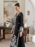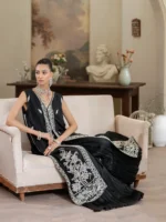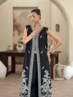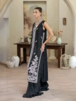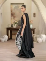 This black gown features a fully embellished front and a stone spray design on the back and sleeveles. The blouse is made of simple black raw silk with heavy embellished borders on the sleeves. It is paired with a crushed sharara for a complete elegant look.