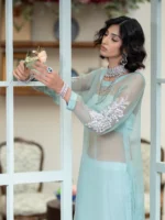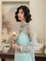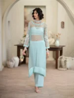 A sophisticated fusion of traditional fabric and contemporary design, this 3-piece ensemble pairs a sheer long organza shirt with statement embellished puffy sleeves, layered over a short SHESHA silk blouse. The look is completed with wide-leg Shesha silk trousers, offering a graceful silhouette with rich texture and shine. Perfect for festive evenings, wedding events, or statement formalwear.