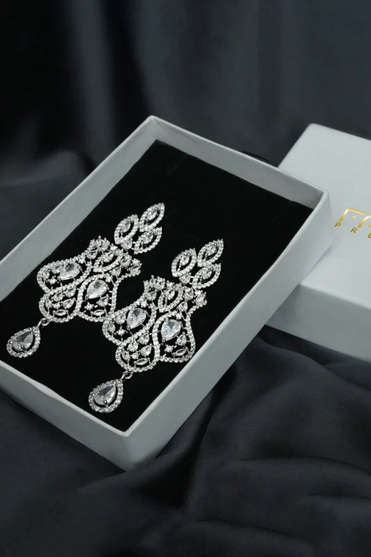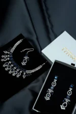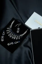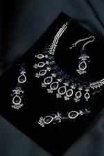 A beautiful silver set with deep blue stones that add a touch of elegance and charm. This three-piece set includes a necklace, earrings, and tikka — perfect for formal events or festive occasions.